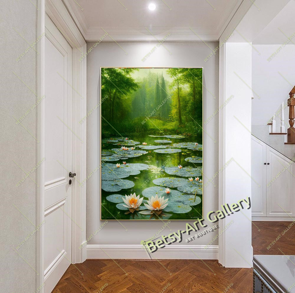 - Immerse your space in calm and balance with this Autumn Birch Forest Canvas Print - Cozy Fall Landscape Wall Art, featuring a lush green pond filled with delicate lotus flowers and lily pads.