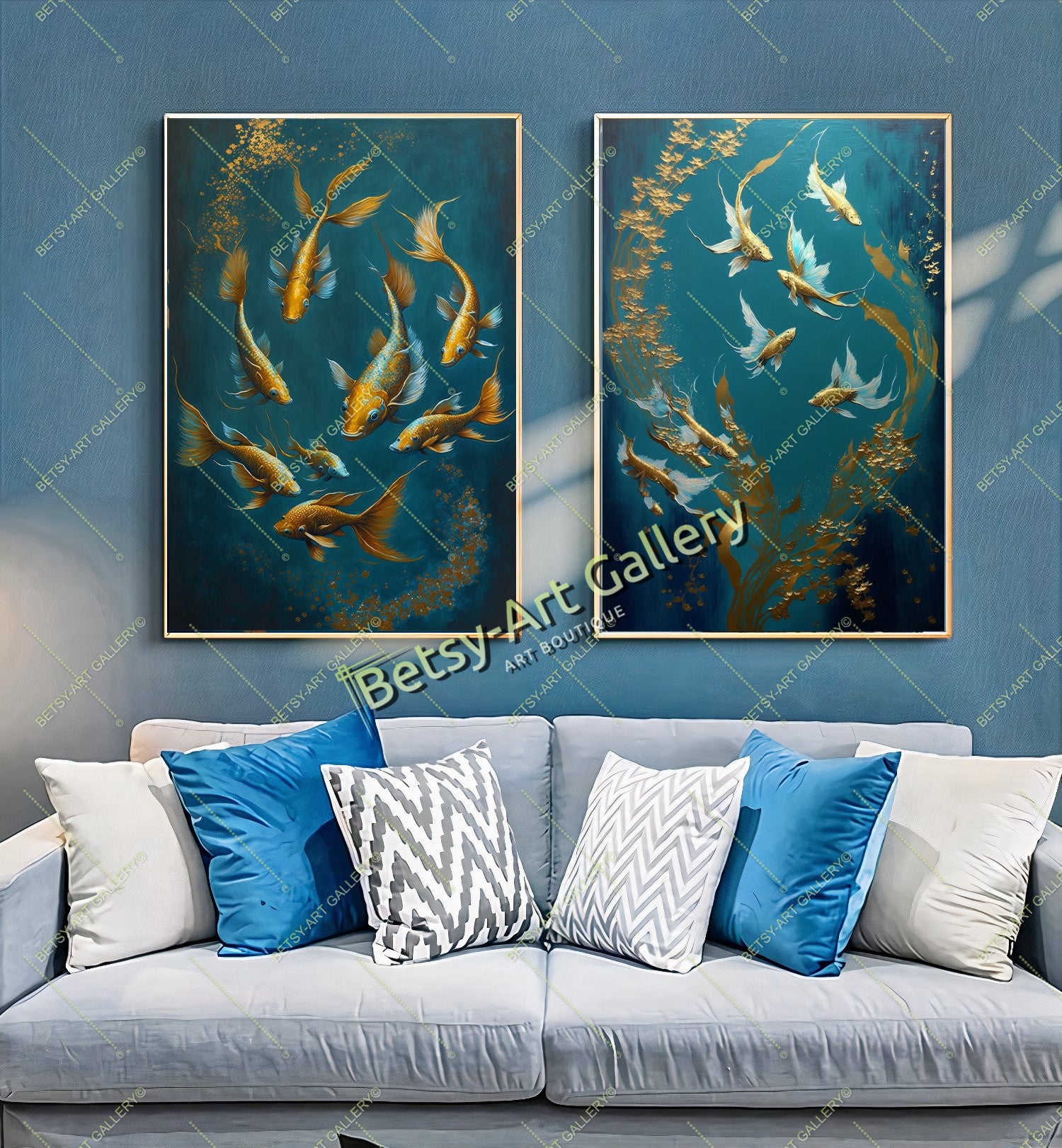 - Elevate your space with this Gold Abstract Koi Fish Canvas Print - Elegant Fish Wall Art, symbolizing harmony and prosperity. Its gold and white palette adds sophistication to modern and minimal interiors.
