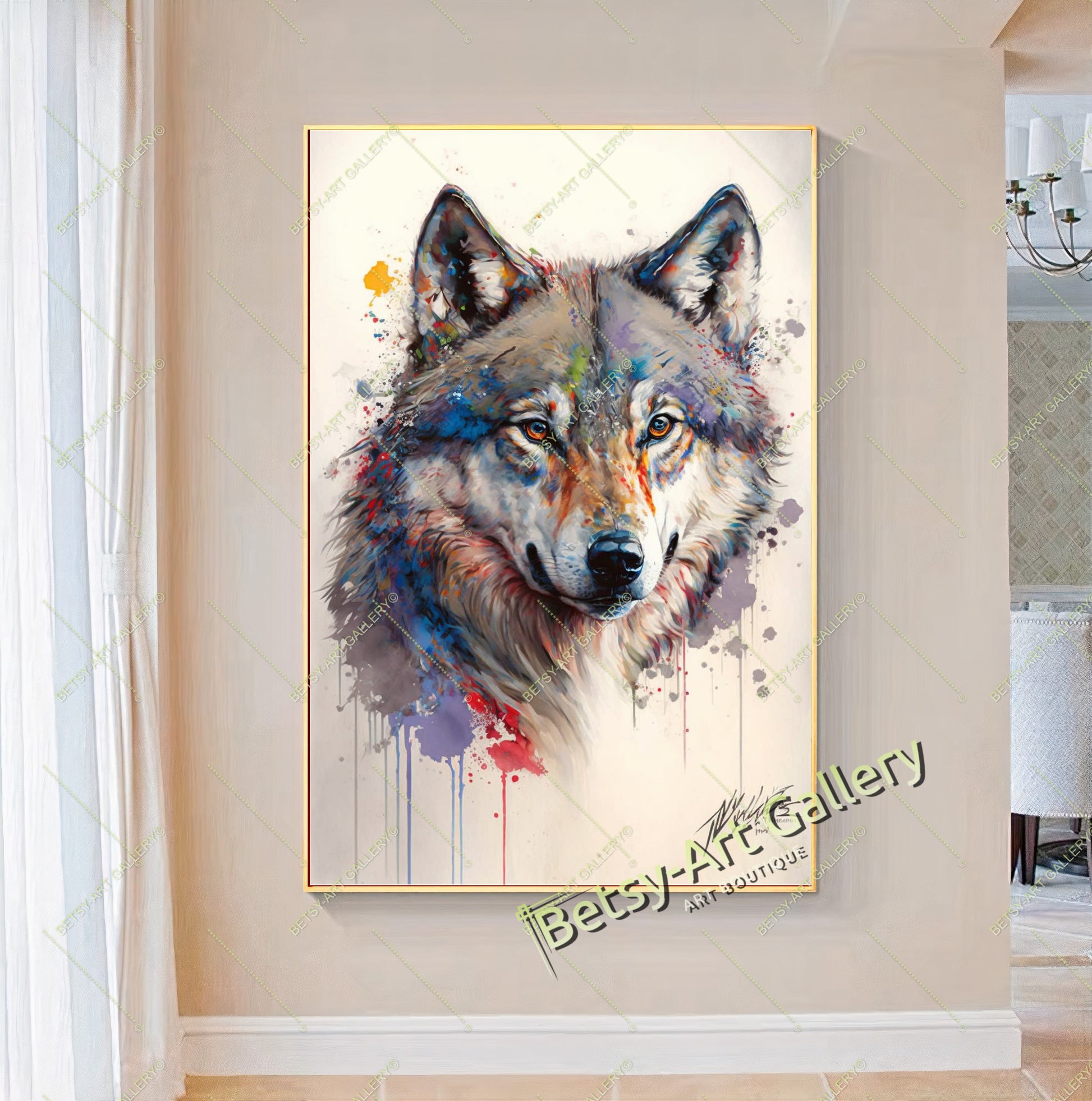 - Featuring a beautifully detailed wolf in flowing watercolor tones, this piece blends nature and art for a serene yet powerful aesthetic — perfect for nature lovers and modern interiors.